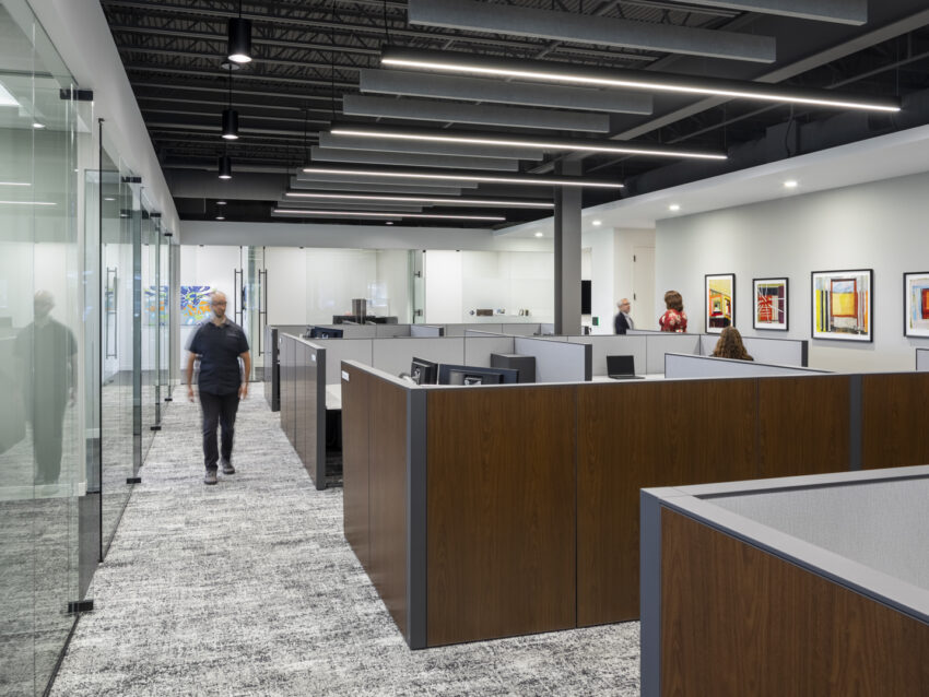 The original showroom was demolished to design a central hub for the company’s multiple departments which includes offices, training rooms, collaboration spaces and conference rooms. To save much of the original building, the previous service area was renovated to become café space, an employee fitness area and a field division warehouse.