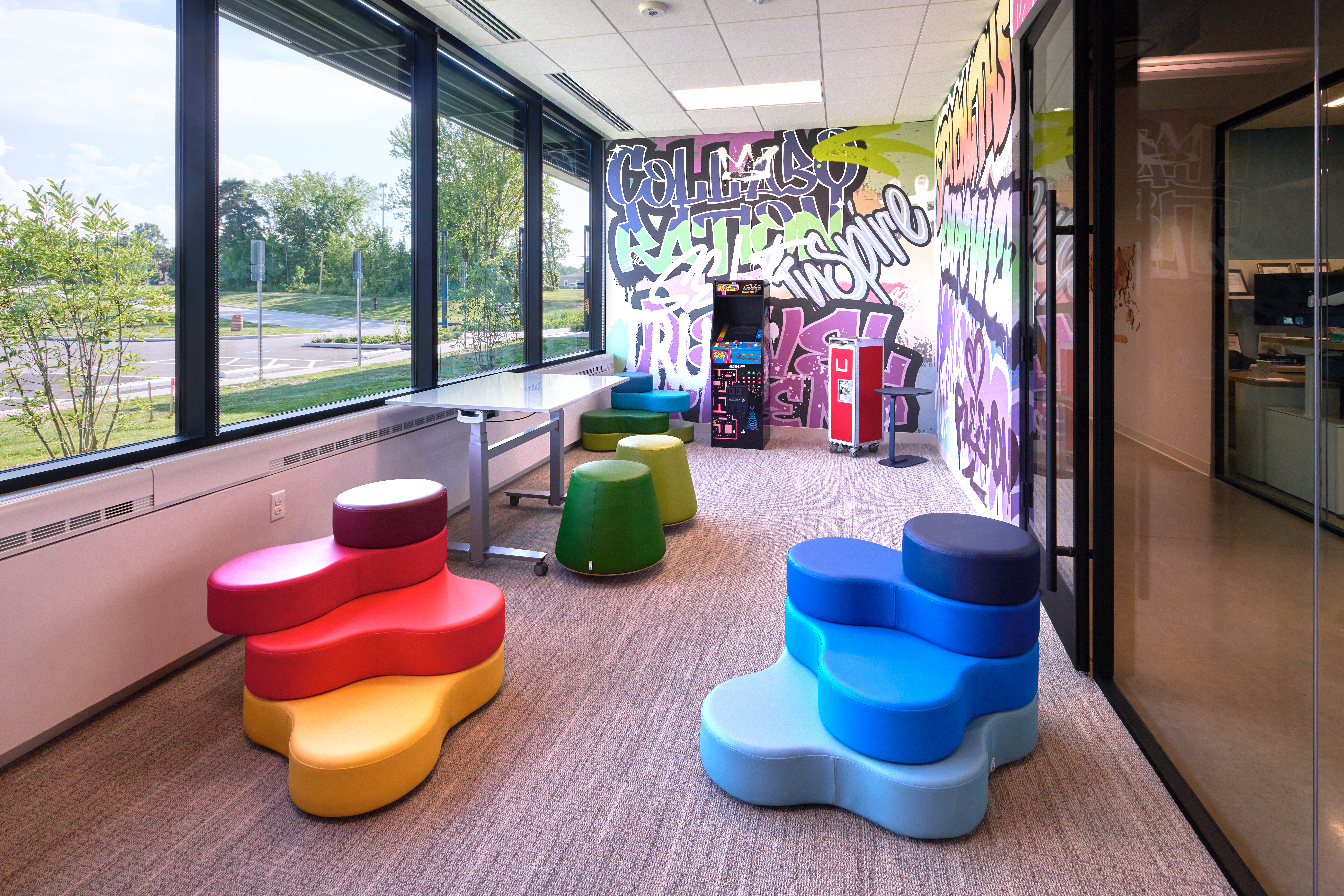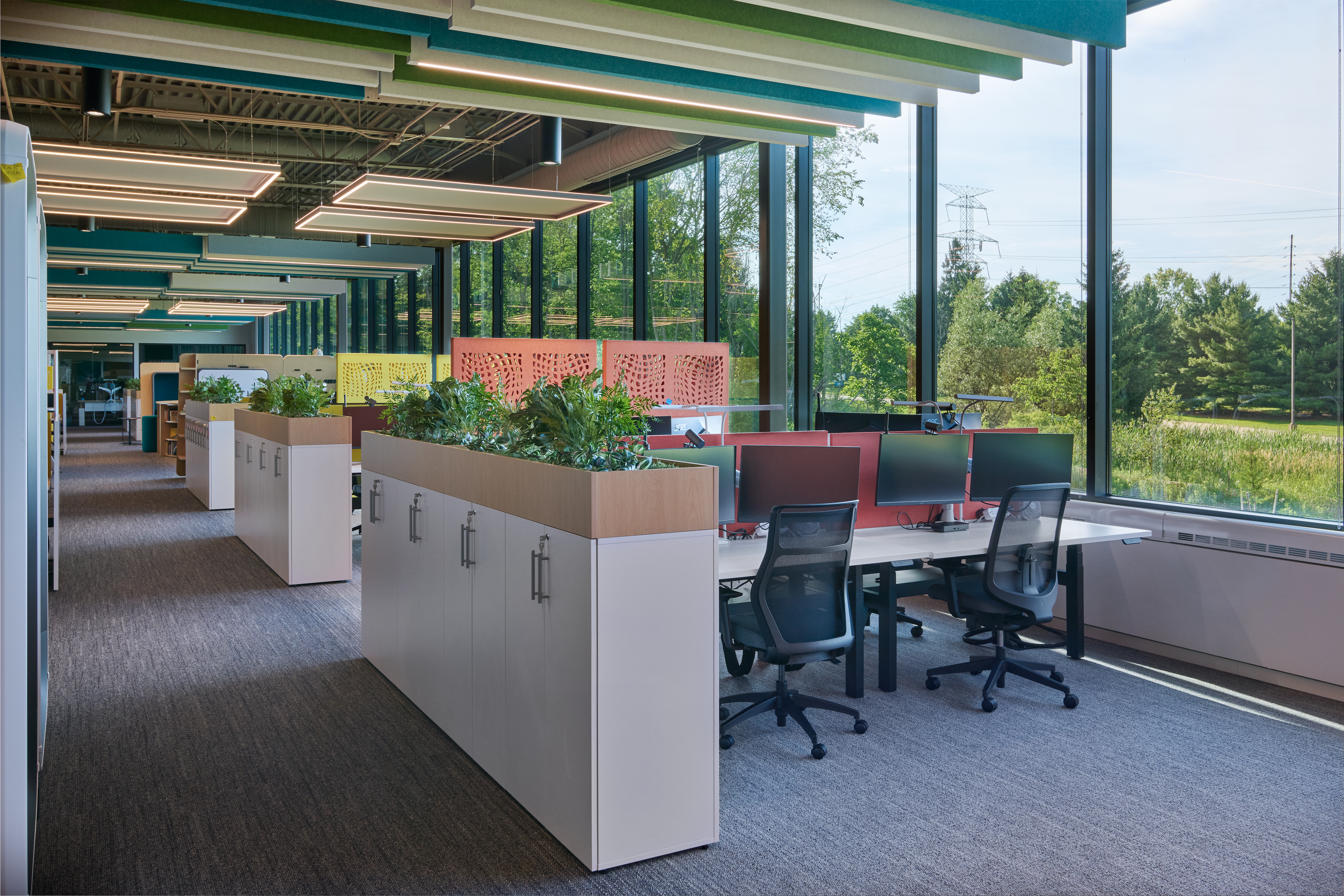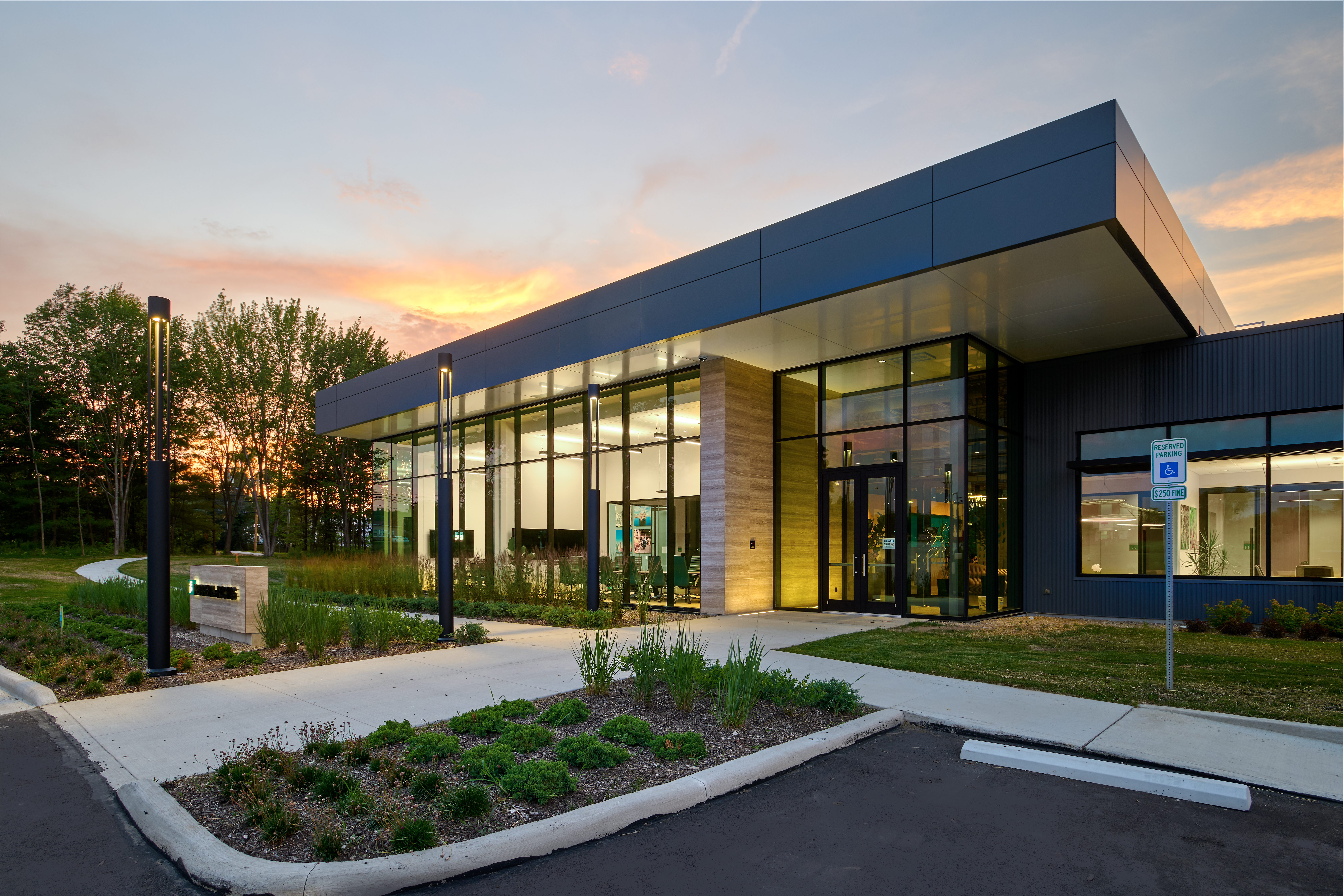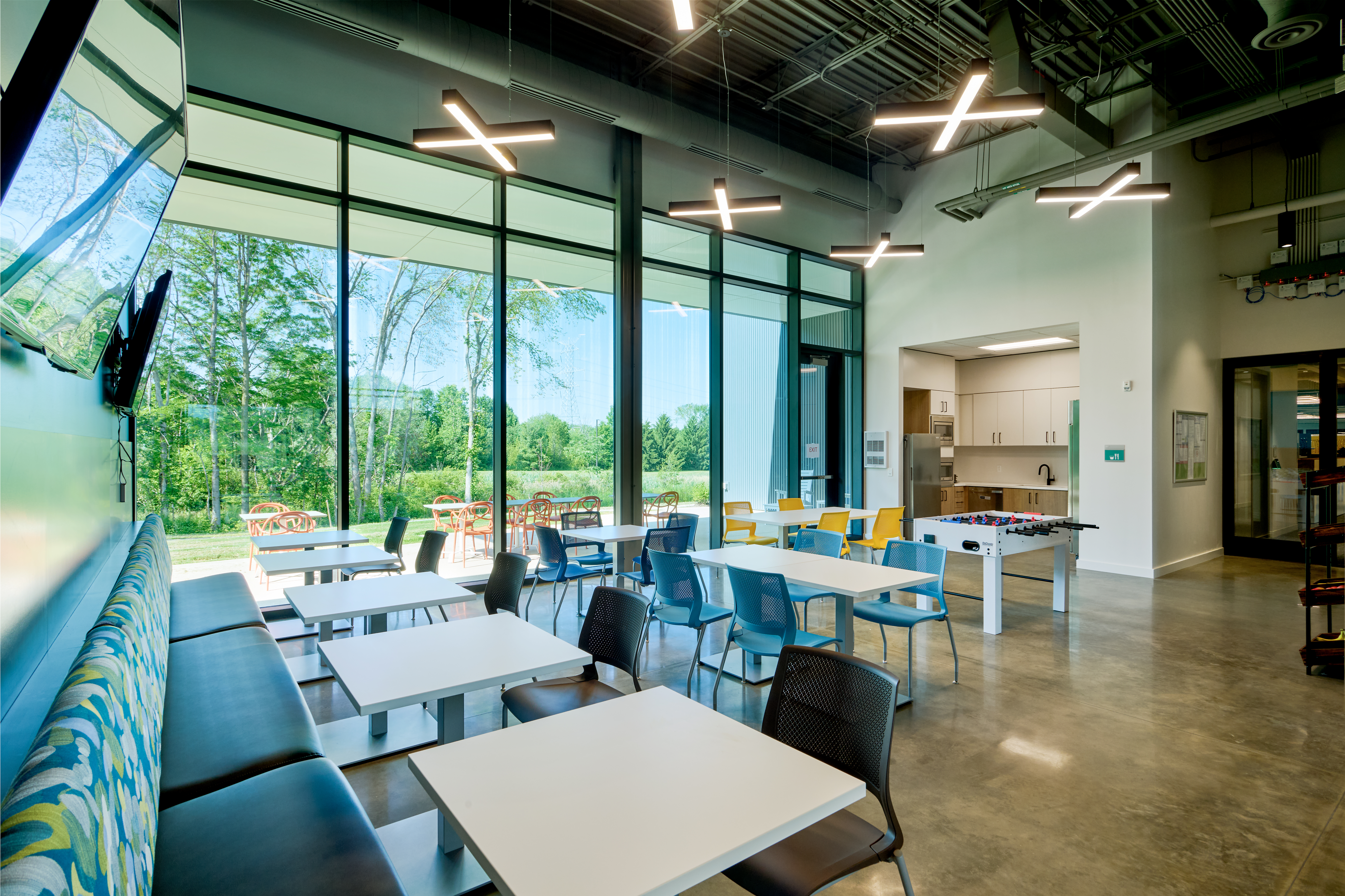 Anchored by a clear north-south and east-west circulation concept called The Concourse, the building’s layout promotes intuitive movement, collaboration, and interaction. Positioned between a forested area to the north and wetlands to the northeast, the facility embraces its surroundings with expansive views, outdoor spaces, and sustainable design strategies.