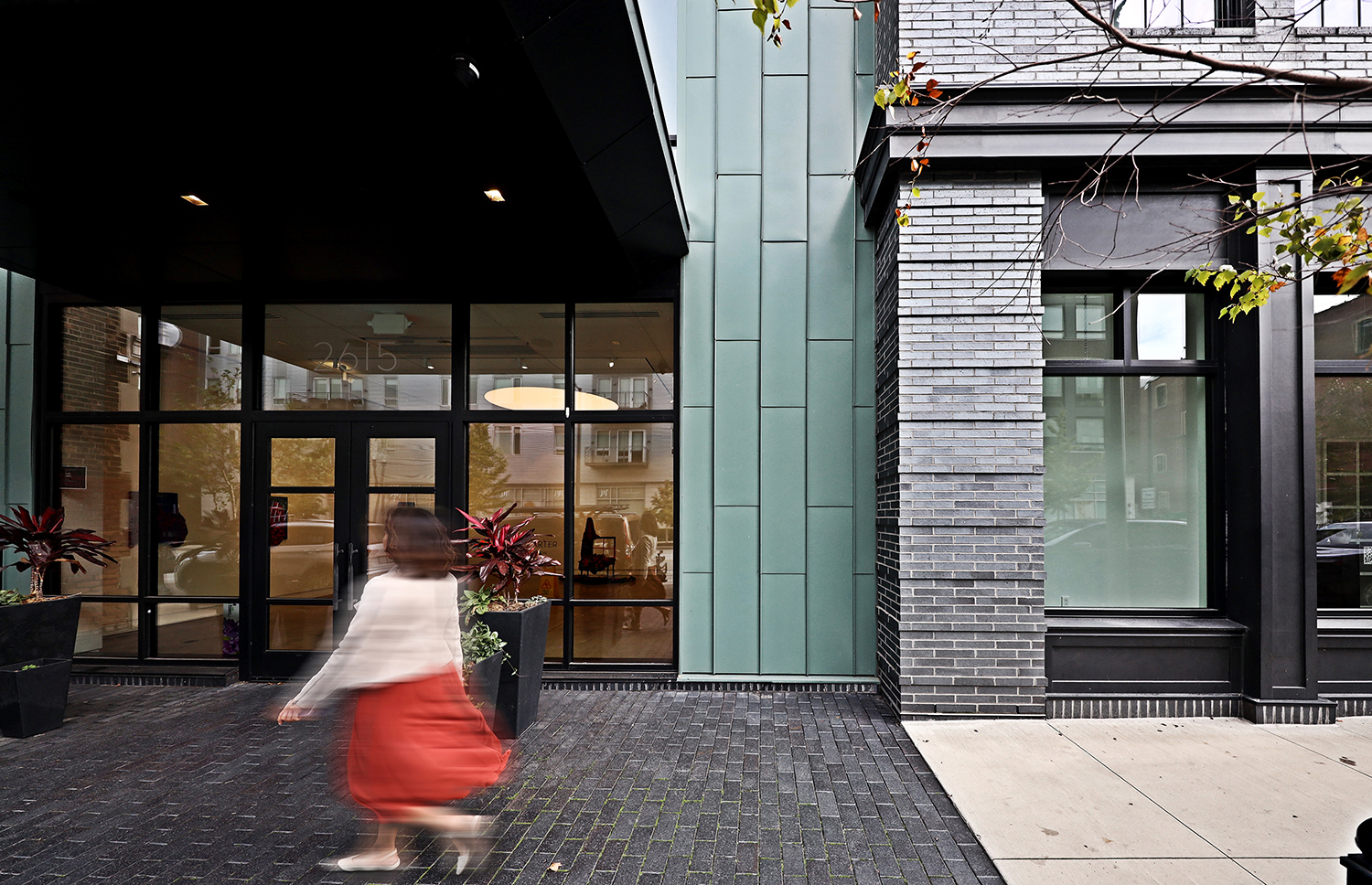 The new structure includes 79 residential units, an art gallery, retail, and commercial spaces. It replaced what used to be an unused parking lot. It was thoughtfully designed as a contemporary building using historic cues from the neighborhood to drive its formal language and material detailing. Most of the building is clad in luxurious ironspot brick and corrugated metal panel, balancing a monochromatic color palette with sharp details, and rich texture. The new brick structure is linked to the existing historic building by a highly contrasted architectural feature that highlights the building’s main entrance. The bold metal panel shingle was inspired by the patina of many standing seam copper roofs of notable historic buildings across the city. The ground floor was carefully planned to accommodate both an indoor parking garage, as well as street-facing retail and commercial spaces to maintain the character of a Pedestrian Retail Overlay zoning district.